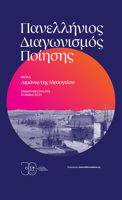 Το Ίδρυμα Αικατερίνης Λασκαρίδη προκηρύσσει πανελλήνιο διαγωνισμό ποίησης, με θέμα: «Λιμάνια της Μεσογείου». Ο διαγωνισμός διοργανώνεται με αφορμή τη δράση «Poesea: Η θάλασσα στη λογοτεχνία» και, κατά την πρώτη φάση, αφορά στο κοινό από 18 έως και 50 ετών. Σκοπός του διαγωνισμού, όπως και της εφαρμογής poesea.gr, είναι οι συμμετέχοντες/συμμετέχουσες να αναδείξουν μέσα από την ποίησή τους λιμάνια της Μεσογείου αλλά και να συμμετάσχουν με τα ποιητικά τους έργα στον εμπλουτισμό της εφαρμογής. |