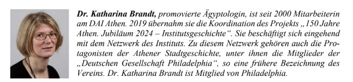 Stammtisch und Vortrag von Dr. Katharina Brandt (DAI) am 8.5.2025Η Dr. Katharina Brandt, ερευνήτρια του DAI Athen, και συντονίστρια του έργου “150 Jahre Athen. Juniläum 2024 – Institutsgeschichte”, δίνει μία διάλεξη στο Philadelphia στο πλαίσιο της σειράς Philadelphia-Stammtisch, που έχει καθιερωθεί και διοργανώνεται την δεύτερη Πέμπτη κάθε μήνα. Αυτή την φορά θα μιλήσει την Πέμπτη 8.5.2025 στις 19.00 στο Philadelphia Haus με θέμα: “Auf Spurensuche: Philadelphia im Archiv des DAI Athen”, όπου γίνεται και μία σύντομη αναφορά σε καθηγητές της Γερμανικής Σχολής των ετών 1907-1909, πριν δηλαδή από τον Α’ Παγκόσμιο Πόλεμο. |