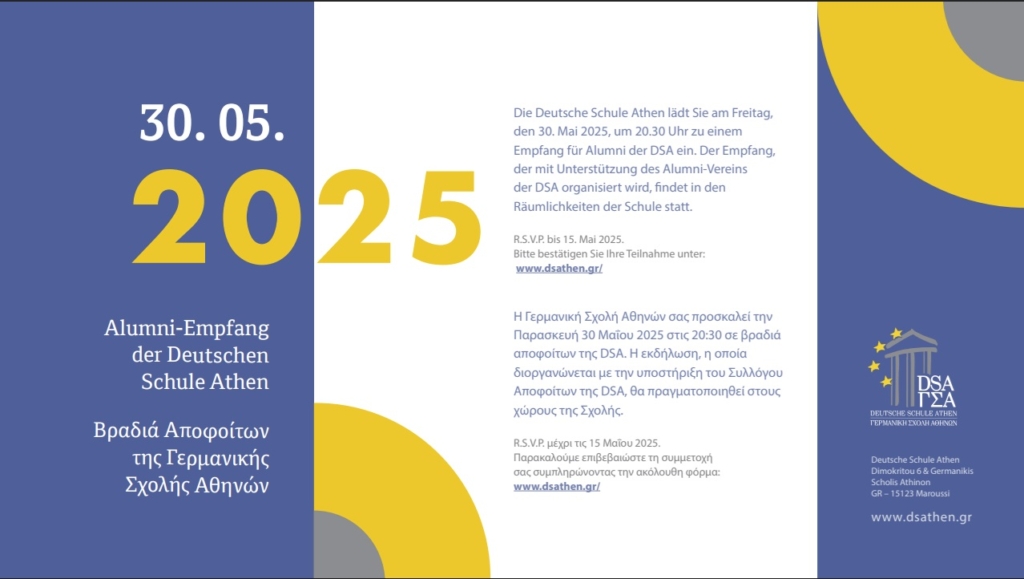 Η εκδήλωση, η οποία διοργανώνεται με την υποστήριξη του Συλλόγου Αποφοίτων της DSA, θα πραγματοποιηθεί στην Σχολή. R.S.V.P. μέχρι τις 15 Μαΐου 2025 / bis 15. Mai 2025 (περισσότερα…) |