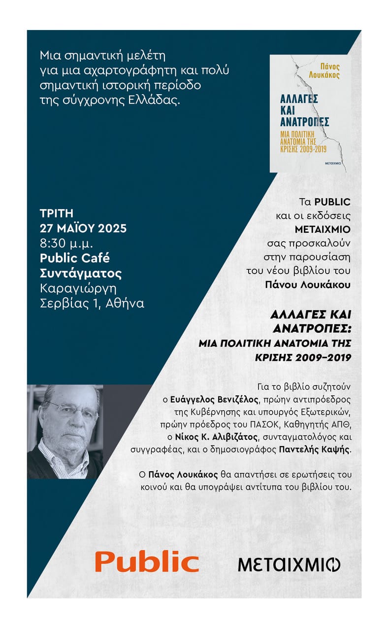 Πάνος Λουκάκος: “Αλλαγές και ανατροπές” την Τρίτη 27 Μαΐου στο Public