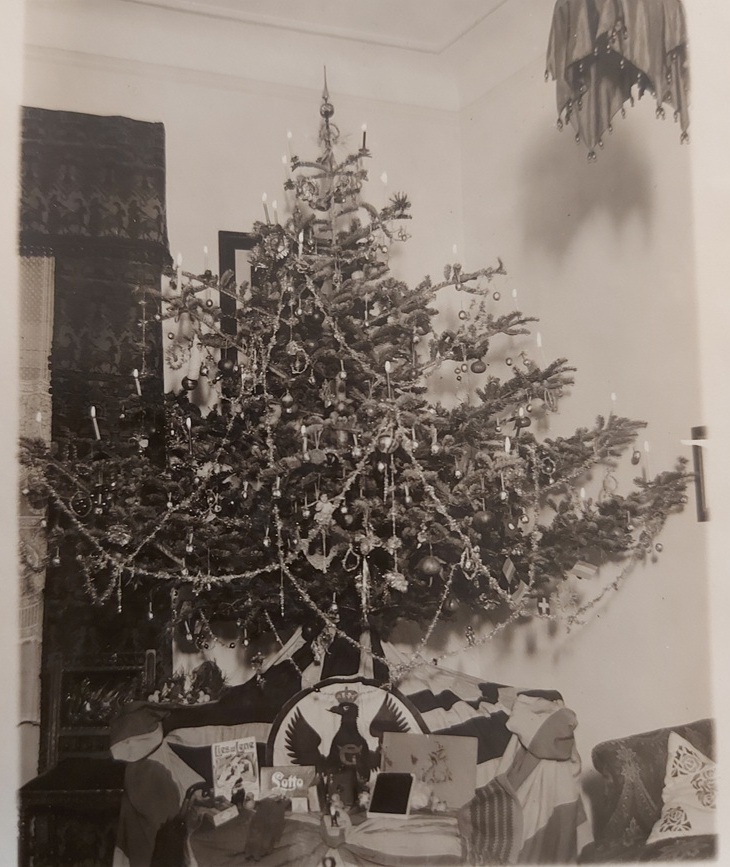 Οικία Οικογένειας Στάγγεσερ: Χριστούγεννα 1925![]() πηγή: Μάνος Στάγγεσερ-Διαμαντής Ο Μάνος Στάγγεσερ-Διαμαντής έστειλε μια φωτογραφία από την οικία Στάγγεσερ από τα Χριστούγεννα του 1925. Τα κεριά είναι φυσικά και αναμμένα. Στην βάση του χριστουγεννιάτικου δένδρου δεσπόζει ο αετός με την σημαία να καλύπτει όλο το τραπέζι.