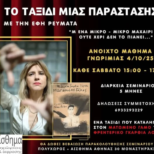 Η ηθοποιός και σκηνοθέτις Έφη Ρευματά (’91) θα οργανώσει το σεμινάριο “Το Ταξίδι μιας Παράστασης” στον Πολυχώρο Αίσθημα, Αθηνάς 30, Μοναστηράκι. Διάρκεια: 5 μήνες. Κάθε Σάββατο, 15.οο – 17.οο Ανοιχτό μάθημα γνωριμίας 4/10/25, Δηλώσεις συμμετοχής: 6933 293229 |